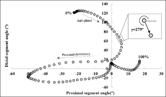 Angle–angle diagram of a swimmer’s start. The proximal segment corresponds to the trunk, and the distal segment corresponds to the thigh.