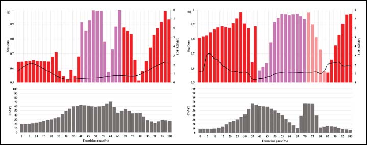 Coupling angle mapping (CAM), segmental dominance (Seg.Dom), Inter-data point range of motion (IDP-ROM) and coupling angle variation (CAV) profiling representing mean elite (g) and sub-elite (h) trunk-thigh coordination during transition phase (See Figure. 3 for colour-scale legend).