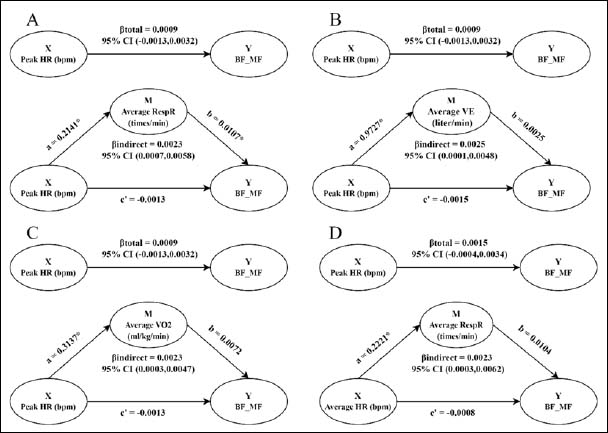 Mediation models showing indirect effects of heart rate (HR) indices (X) on biceps femoris (BF) electromyography median frequency (MF) (BF_MF, Y) via respiratory–metabolic variables (M). (A-C) Peak HR (beats·min-1) as X with Average respiratory rate (RespR), minute ventilation (VE), or oxygen uptake (VO2) as M. (D) Average HR as X and Average RespR as M. Path coefficients (a, b, c′), bootstrapped 95% confidence intervals (CIs), and indirect effects (a×b) are reported. p < 0.05.