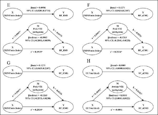 Mediation models showing indirect effects of internal-load indicators (X) on rectus femoris (RF) electromyography (EMG) outcomes (Y) via respiratory–metabolic variables (M). (E-G) Training impulse per minute (TRIMP·min-1) as X with peak oxygen uptake (VO2 mL·kg-1·min-1) as M and RF root-mean-square amplitude (RF_RMS), RF averaged EMG amplitude (RF_aEMG), or RF integrated EMG (RF_iEMG) as Y. (H) total energy expenditure (EE_total, kcal) as X, average VO2 (mL·kg-1·min-1) as M, and RF_aEMG as Y. Path coefficients (a, b, c′), bootstrapped 95% confidence intervals (CIs), and indirect effects (a×b) are shown. p < 0.05.