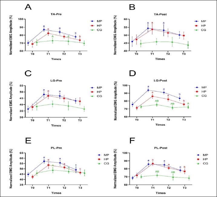 Temporal changes in EMG amplitude (RMS) during pre- and post-activation phases of peri-ankle muscles at different pressures (A) Temporal changes of pre-activation of TA; (B) Temporal changes of post-activation of TA; (C) Temporal changes of pre-activation of LG; (D) Temporal changes of post-activation of LG; (E) Temporal changes of pre-activation of PL; (F) Temporal changes of post-activation of PL. Note: Lowercase letters indicate significant differences between time points: a, vs. baseline (T0), P < 0.05; b, vs. T1, P < 0.05; c, vs. T2, P < 0.05; d, vs. T3, P < 0.05. Uppercase letters indicate significant differences between groups at the same time point: A, vs. MP group, P < 0.05; B, vs. HP group, P < 0.05. MP, medium-pressure; HP, high-pressure; CG, control group; RMS, Root Mean Square; TA, tibialis anterior; LG, lateral gastrocnemius; PL, peroneus longus.