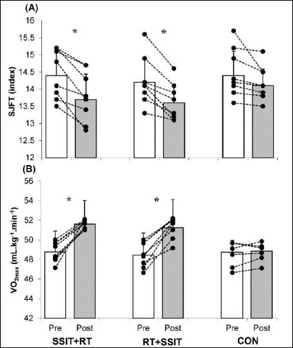 Pre to post-intervention changes in the SJFT and VO2max (mean ± SD). * Significant changes over the training period (p < 0.05).