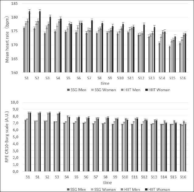 Figure 2. Descriptive statistics (mean and standard deviation) of mean heart rate and perceived exertion levels among volunteers in the SSG and HIIT groups throughout the experimental sessions.