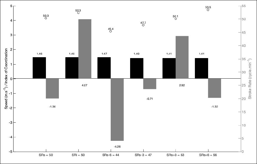 Current stroke rate, speed and index of coordination performed in the 6 stroke rate conditions: spontaneous SR without any instruction (SRs) and imposed spontaneous SR (SRi), spontaneous SR-6 cycles (SRs-6), -3 cycles (SRs-3), +3 cycles (SRs+3), +6 cycles (SRs+6).