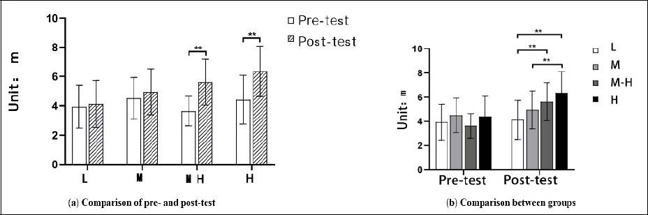 Interaction analysis for the tennis throwing performance (* indicates p < 0.05, ** indicates p < 0.01).