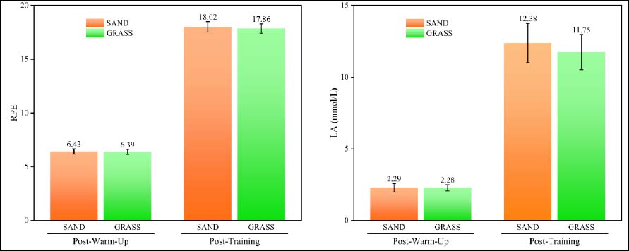 RPE and LA from post-warm-up to post-training on SAND and GRASS.