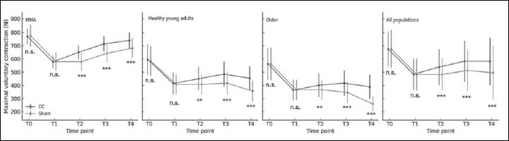 Recovery of maximal voluntary contraction (MVC) across time points (T0 = baseline, T1 = post-fatigue, T2 = immediately after first intervention, T3 = 24 h, T4 = 48 h). CC: pneumatic cold compression. Between-conditions (CC vs. sham) differences per time point are indicated by asterisks (**p < 0.010; ***p < 0.001). n.s.: no significant. MMA, n = 40; young healthy adults, n = 20; Older, n = 20.