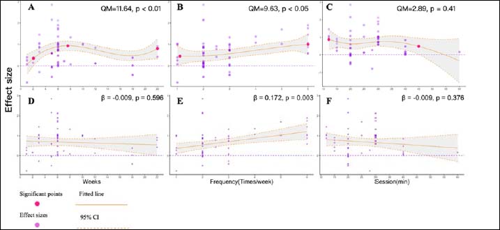 Regression analyses for RAT. A-C Non-linear regression for training duration (weeks), training frequency (times/week) and session time (min) respectively; D-E Linear regression for training duration (weeks), training frequency (times/week) and session time (min) respectively; CI Confidence Interval.