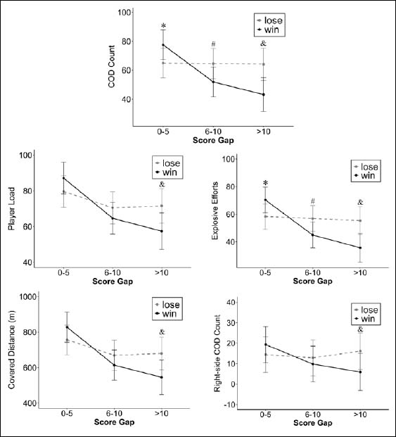 Figure 1. Pairwise comparisons of load variables between winners and losers across different score gap categories (0–5, 6–10, >10 points). Data presented as Estimated Marginal Means ± 95% Confidence Intervals. *Adjusted p < 0.05 between winners and losers under 0-5 score gap; # Adjusted p < 0.05 between winers and losers under 6-10 score gap; & Adjusted p < 0.05 between winers and losers under >10 score gap.