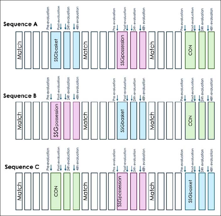 Figure 1. Three-week study design and the three different randomized sequences. SSGbasket: small-sided games with baskets; SSGpossession: small-sided games with ball possession; COM: control (no small-sided games). The arrows illustrate the time points of evaluation.