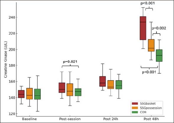 Figure 2. Creatine kinase levels over the four different time points considering the conditions of small-sided with baskets (SSGbasket), in ball possession (SSGpossession) and control (CON). Higher values indicate greater muscle damage (higher CK activity).