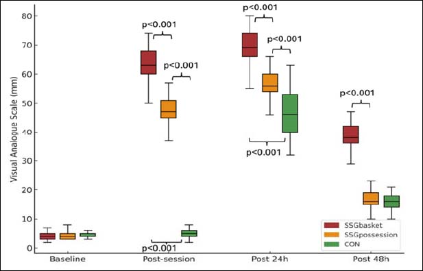 Figure 4. Visual analogue scale (VAS) levels over the four different time points considering the conditions of small-sided with baskets (SSGbasket), in ball possession (SSGpossession) and control (CON). Higher VAS scores indicate greater perceived muscle soreness.