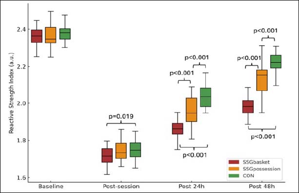 Figure 5. Reactive strength index (RSI) levels over the four different time points considering the conditions of small-sided with baskets (SSGbasket), in ball possession (SSGpossession) and control (CON). Lower RSI values indicate greater neuromuscular impairment (reduced jump performance).