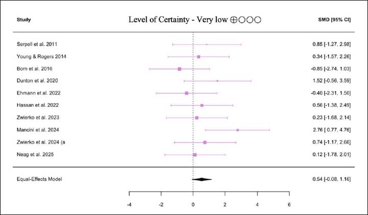 Main effects for RT (p > 0.05). SMD: Standardized Mean Differences; CI: Confidence Interval, GRADE: Certainty of evidence