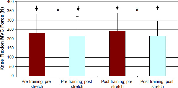 Changes in knee flexion maximal voluntary isometric force (MVIC) before and following an acute bout of static stretching to the point of discomfort. Asterisks indicate significant differences in stretch-induced MVIC force prior to and after a four-week stretch training programme. Bars represent means of the group while vertical lines indicate standard deviation.