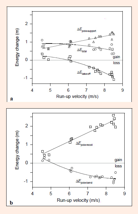 Plot (a) shows the effect of run-up velocity on the energy change of the athlete during the take-off phase (∆ = – ), the energy gain of the athlete due to muscular work performed during the pole support phase of the vault (∆ = – ), and the total energy gain of the athlete during the vault (∆ = ∆ + ∆ = – ). Plot (b) shows the effect of run-up velocity on the energy loss of the athlete during the pole bending phase (∆ = – ) and the energy gain of the athlete during the pole recoiling phase (∆ = – ).