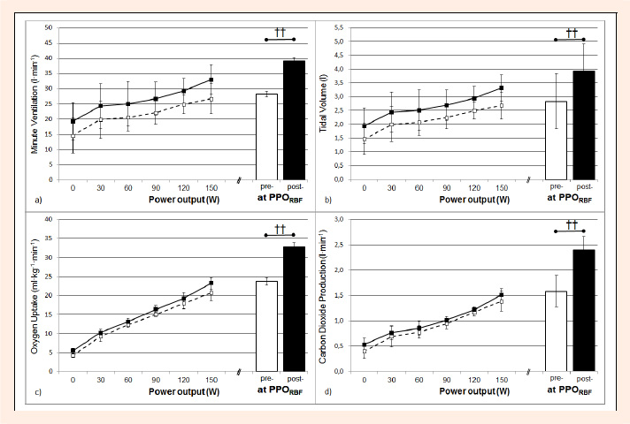Minute ventilation (a), tidal volume (b), oxygen uptake (c) and carbon dioxide production (d) during the incremental test with RBF pre- (white squares and columns) and post-training (black squares and columns) in Group E only. Values are means (±SD). PPO, peak power output at incremental exercise test with reduced breathing frequency. Significant training effect (paired T test): † † p < 0.01.