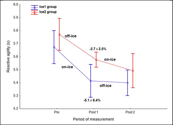Results of the reactive agility test. Ice 1 = group that performed the on-ice agility training first, Ice 2 = group that performed the off-ice agility training first. The values are expressed as mean and SE.