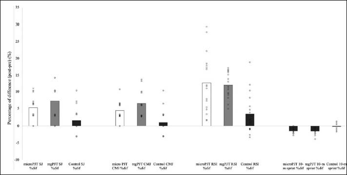 Mean and intra-individual percentages of difference (post-pre) for the different outcomes observed. CMJ: countermovement jump; micro: microdosing; PJT: plyometric jump training; reg: regular; RSI: reactive strength index; SJ: squat jump; %dif: percentage of difference.