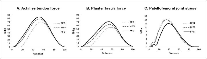 Achilles tendon force (A), plantar fascia force (B), and patellofemoral joint stress (C) during running in each foot-strike pattern. The waveforms represent averages across all participants. RFS, rearfoot strike; MFS, midfoot strike; FFS, forefoot strike.