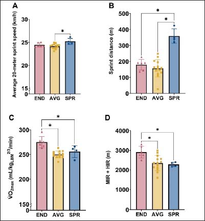 Group differences of the three clusters for their average match sprint distance, average 20-meter sprint speed, average match distance covered at moderate and high intensity, normalized V̇O2max. See the caption of Figure 1 and the text for the characteristics of the three clusters: SPR, END and AVG.