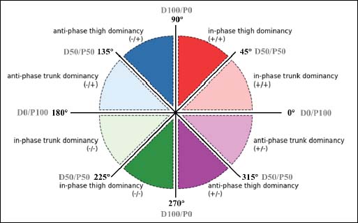 A classification of coordination patterns based on coupling angles. Different colour partitions represent different coordination patterns (black), and segment dominance (grey) is marked around the circumference of the disk graph (D = distal, P = proximal).