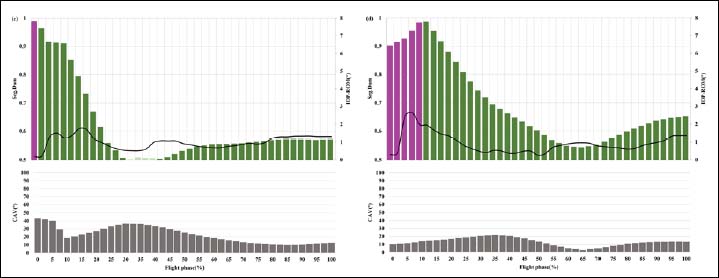 Coupling angle mapping (CAM), segmental dominance (Seg.Dom), Inter-data point range of motion (IDP-ROM) and coupling angle variation(CAV) profiling representing mean elite (c) and sub-elite (d) trunk-thigh coordination during flight phase (See Figure. 3 for colour-scale legend).