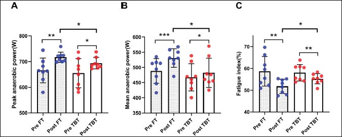 The graphs compare the pre- and post-intervention anaerobic capacity within the flywheel eccentric training and traditional barbell training groups, respectively, as well as the post-experimental significance of the two groups. Flywheel eccentric training is shown in blue and traditional barbell training in red, with each point corresponding to an individual athlete. Panel A is the peak anaerobic power, Panel B is the mean anaerobic power, and Panel C is the fatigue index. Data are presented as means ± standard deviation (M ± SD).