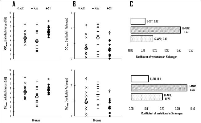 Individual changes (A), residuals in individual changes (B), and (C) coefficient of variations (CV) in mean group changes in maximal cardiac output (COmax) and stroke volume (SVmax) in response to seven weeks of high-intensity interval training prescribed using anaerobic speed reserve (ASRHIIT), maximal aerobic speed (MASHIIT) and maximal exertion [i.e., sprint interval training (SIT)]. Circles indicate represent the group mean response. * Significant difference vs. pre-training (p ≤ 0.05). † Significantly lower than MASHIIT group (p ≤ 0.05).