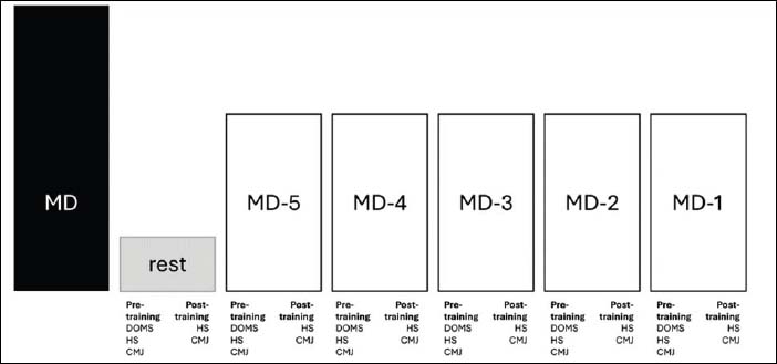Illustration of weekly monitoring and evaluation. MD: Match Day; DOMS: Delayed Onset Muscle Soreness; HS: Hamstring Strength; CMJ: Countermovement Jump.