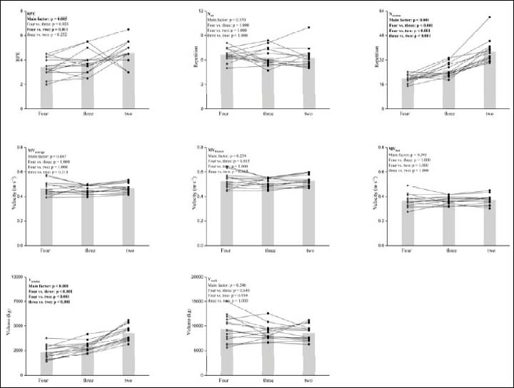 Comparison of mechanical variables across training sessions with different frequencies. Upper panel from left to right: Rating of Perceived Exertion (RPE), number of repetitions performed per set (Nset), number of repetitions performed per session (Nsession); middle panel from left to right: average set mean velocity (MVaverage), fastest mean velocity (MVfastest), mean velocity of the last repetition (MVlast) from all training sets; lower panel from left to right: training volume of the session (Vsession), training volume of the week (Vweek).