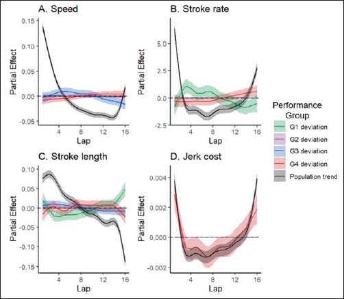 Common population trends and specific deviation functions by performance group for the regulation of pacing (panel A) and stroke mechanics (i.e., stroke rate (panel B), stroke length (panel C), and jerk cost (panel D)) across the 400 m, based on the partial effects of the fitted HGAMs.