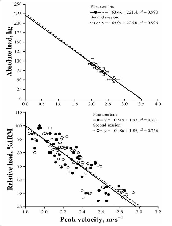 Averaged across the participants’ relationships between: absolute load and peak velocity (upper-panel), and relative load and peak velocity (lower-panel). The equation and goodness-of-fit (r2) are shown. 1RM, 1-repetition maximum.