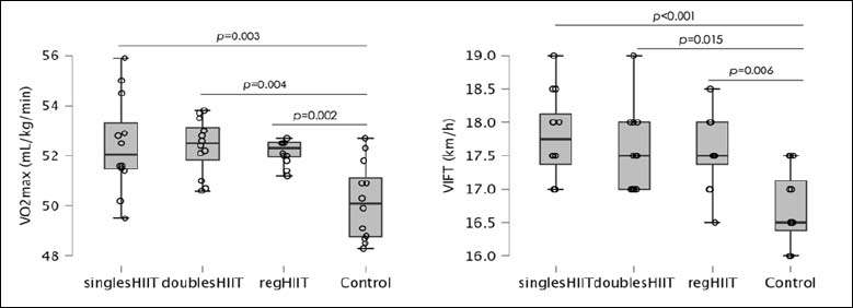 Boxplots of post-test maximal oxygen uptake (VO