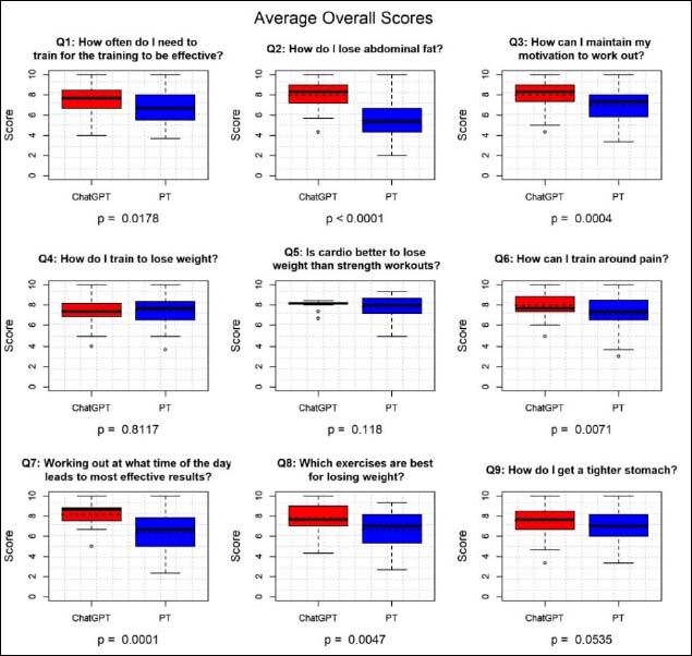 Overall grades for the answers to the questions given by ChatGPT (green, left) and PTs (blue, right). The upper and lower bounds of the boxplots present the interquartile range, the red dotted line inside the box represents the average, and the black solid line represents the median of the data. The upper and lower lines beyond the box (whiskers) are the highest and lowest values, respectively, excluding outliers.