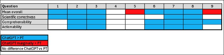 The grading components outlined for each question with a color scheme representing occasions in which ChatGPT scores higher (blue) or marginally higher (red) than PTs.