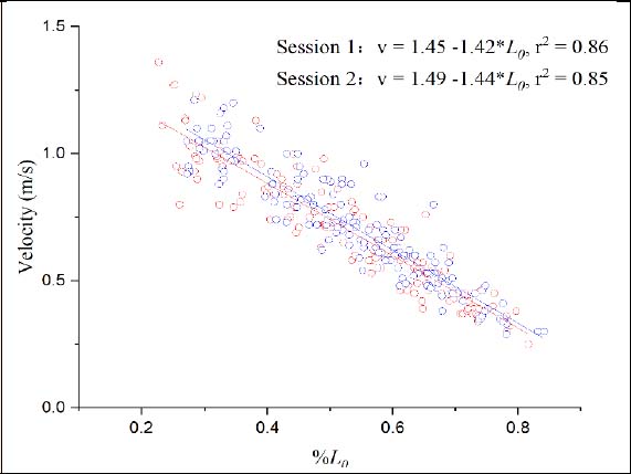 The load-velocity relationship in different sessions (red line and point for Session 1, blue line and point for Session 2).