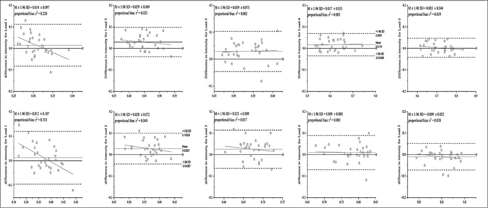 Bland-Altman plots illustrating the agreement between predicted and actual loads for the %1RM-MV relationship (upper panel) and the %L0-MV relationship (lower panel) across progressively increasing load intensities (left to right). L0, load-intercept; 1RM, one repetition maximum; R2, coefficient of determination.