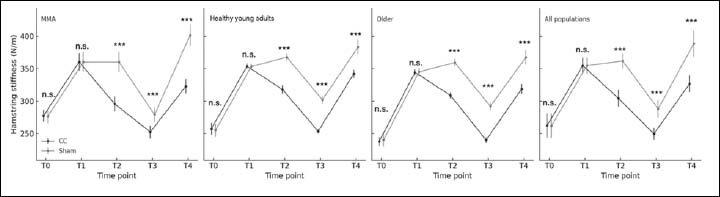 Recovery of hamstring muscle stiffness across time points (T0–T4) in MMA athletes. CC: pneumatic cold compression. Between-conditions (CC vs. sham) differences per time point are indicated by asterisks (***p < 0.001). n.s.: no significant. MMA, n = 40; young healthy adults, n = 20; Older, n = 20.