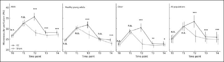 Microvascular perfusion expressed as perfusion units (PU) across time points (T0 - T4). CC: pneumatic cold compression. Between-conditions (CC vs. sham) differences per time point are indicated by asterisks (* p < 0.05; ** p < 0.010; *** p < 0.001) ns: no significant. MMA, n = 40; young healthy adults, n = 20; Older, n = 20.