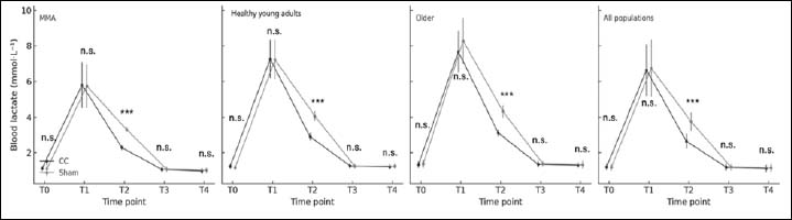 Blood lactate concentrations (mmolBL-1) across time points (T0–T4). CC: pneumatic cold compression. Between-conditions (CC vs. sham) differences per time point are indicated by asterisks (*** p < 0.001). ns: no significant. MMA, n = 40; young healthy adults, n = 20; Older, n = 20.