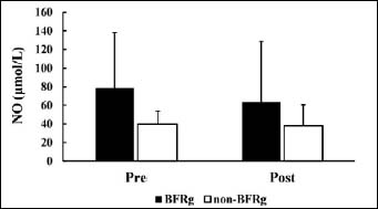 Changes in NO before and after BFR training. NO: nitric oxide; BFRTg: blood flow restriction training group; Time × group interaction: p = 0.481 (η