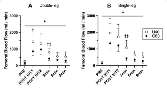 Figure 1. Femoral blood flow before (PRE) and after (POST) double- and single-leg cycling in older (O60) and younger (U40) endurance-trained individuals. *, Main effect of age, comparisons made between all older and all younger subjects, regardless of modality. † , Main effect of modality, comparisons made between DL and SL cycling, regardless of age. ‡, Interaction effect between modality and age Values are presented as mean ± SD.