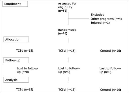 Enrollment, allocation, and analysis of the participants. TC3d: Tai Chi 3 days a week; TC5d: Tai Chi 5 days a week.