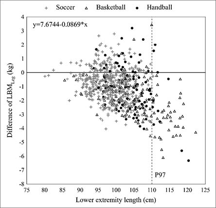 Relationship between lower extremity length and the difference in lower extremity Lean Body Mass outcome between DXA and BIA. P97: 97th percentile.