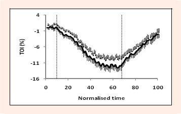 TOI profiles (mean and SE). Solid line indicates NVIB and dotted line VIB conditions. Vertical dashed lines indicate start and end of the exercise protocol.