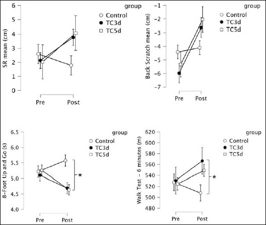 Figure 4. Mean and confidence intervals (95%) for the sit and reach test (SR), back scratch test, 8-foot up and go and the walt test - 6 minutes. *: significant differences between groups (p < 0.05): TC3d: Tai chi training 3 days/week; TC5d: Tai chi training 5 days/week.