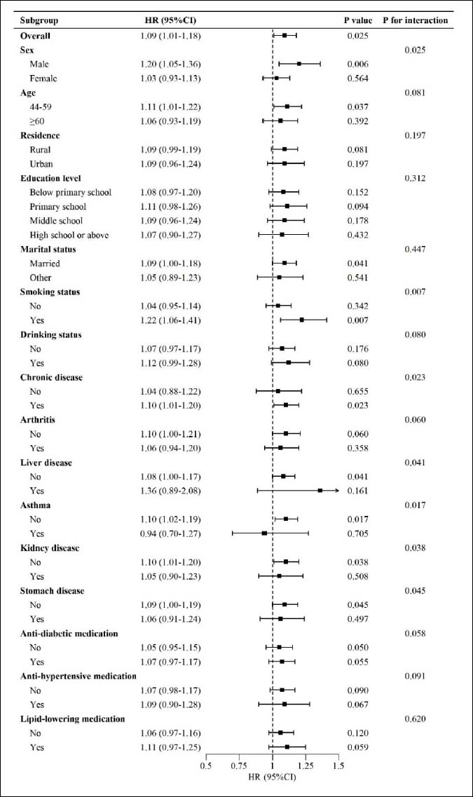 Subgroup analyses of the association between the C-reactive protein - triglyceride-glucose index (CTI) and risk of dyslipidemia.